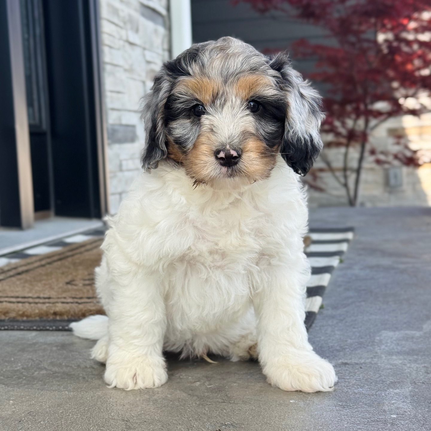DONNY'S FAMILYDonny is our stunning F1b Blue Merle tri-color Tiny Bernedoodle male. Donny will be approximately 15-25 lbs. full grown and will have a hair coat that will stay on the wavy side as an adult. Donny has a very sweet personality and is more on the laid-back side. He was born on Tuesday, March 3 to Quana & Banjo and will be ready for his new home on Tuesday, April 28th. 4,000.00